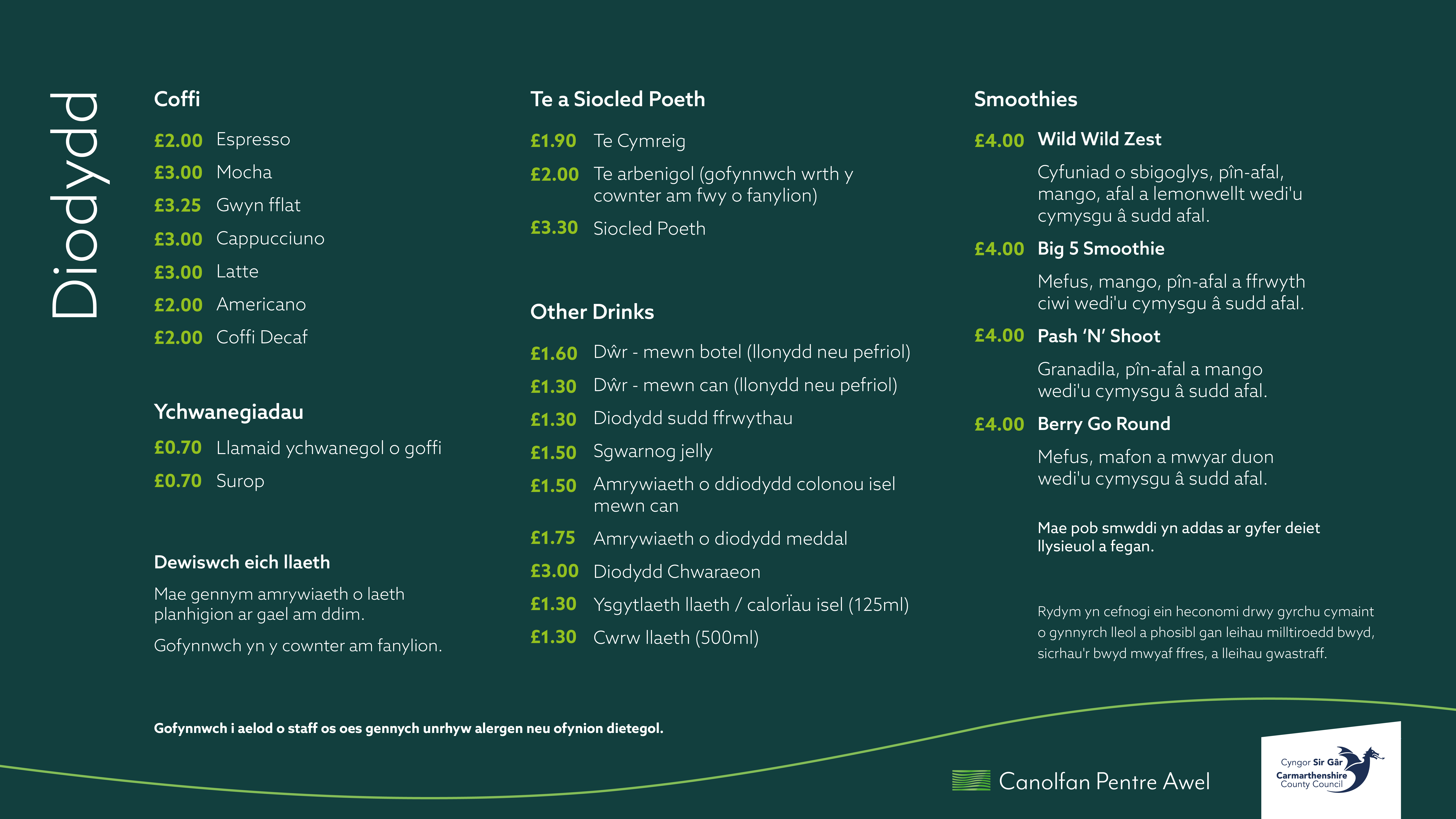 Mae'r caffi yng Nghanolfan Pentre Awel yn lle cynnes a chroesawgar i ymwelwyr ymlacio a mwynhau dewis o brydau bwyd wedi'u paratoi'n ffres, byrbrydau a diodydd. Yma, gallwch chi gael coffi cyflym, cinio ysgafn neu seibiant ar ôl archwilio'r Ganolfan. Mae awyrgylch clyd yn y caffi a bwydlen sy'n cynnig rhywbeth at ddant pawb.