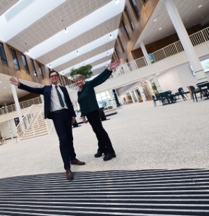 Bouygues UK a Chyngor Sir Gâr yn dathlu hysbysfyrddau newydd Pentre Awel sydd wedi’i dylunio gan fyfyrwyr Coleg Sir Gâr